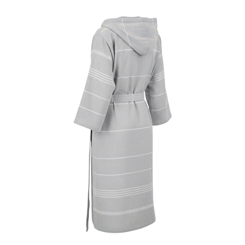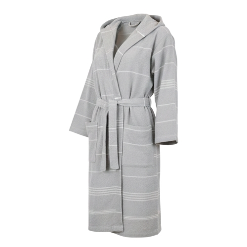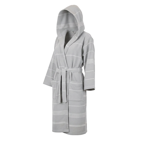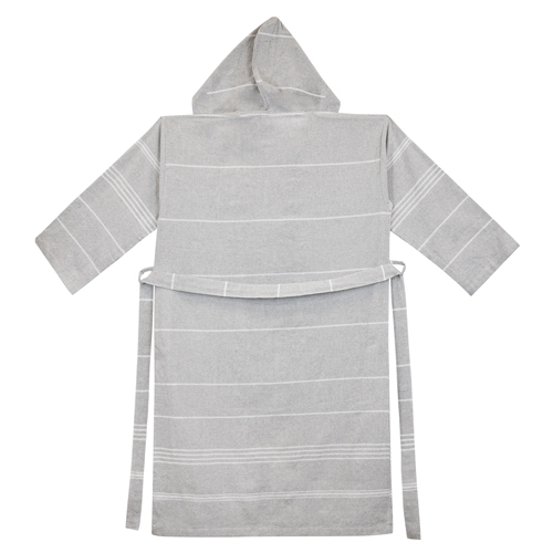 Roupão de banho 100% algodão com estampado horizontal às riscas em tons de cinza. Macio, leve e com capuz, é ideal para piscina, spa ou para usar depois do banho.Possui dois bolsos frontais, cinto a condizer e alça interior para pendurar.