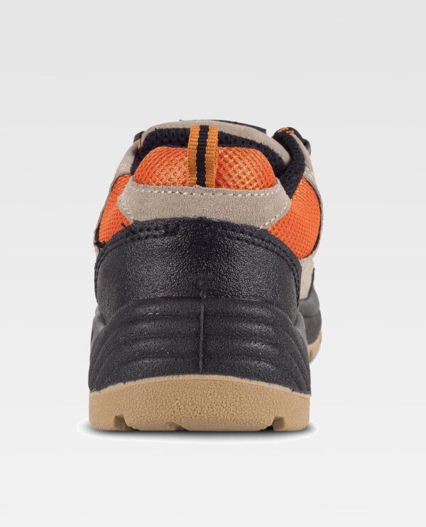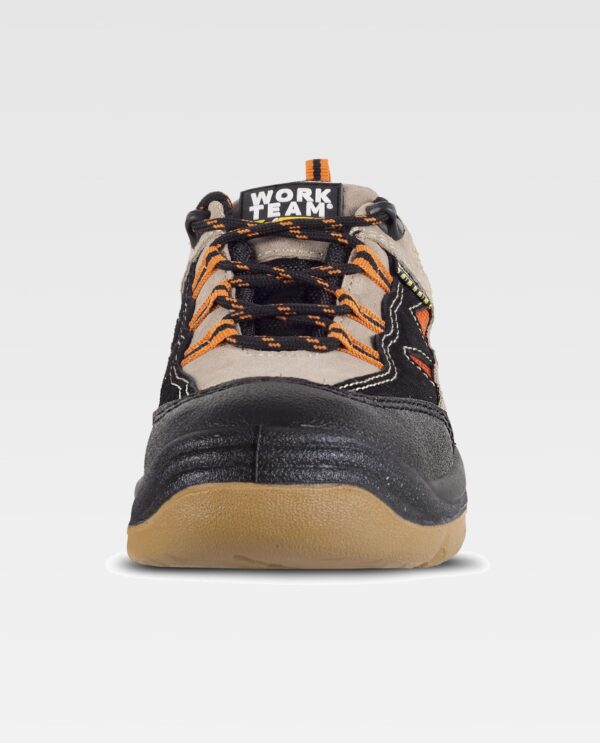 Sapato croute com cordões, tipo trekking. Biqueira e palmilha de aço. Sola PU bidensidade. Propriedades antiestáticas. Absorção da energia na zona do salto. Resistente aos hidrocarbonetos. Resistente à perfuração. Resistente ao deslizamento sobre ladrilho cerâmico com dissolução de sabão e sobre aço com glicerina.