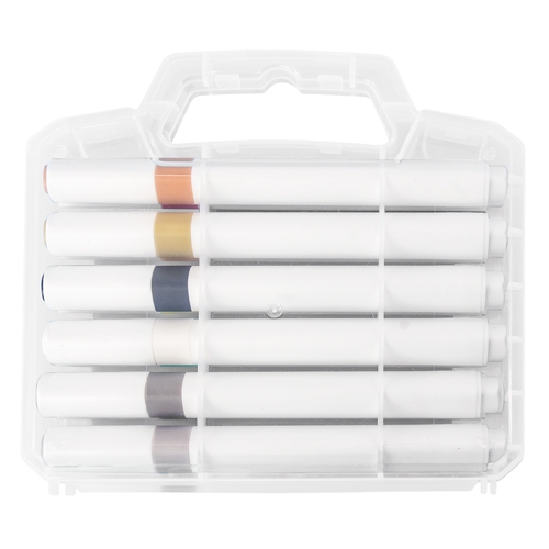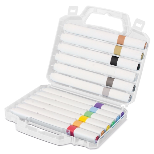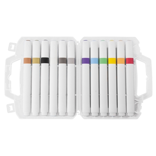 Conjunto de 12 marcadores acrílicos de cores sortidas, apresentados numa pasta transparente.