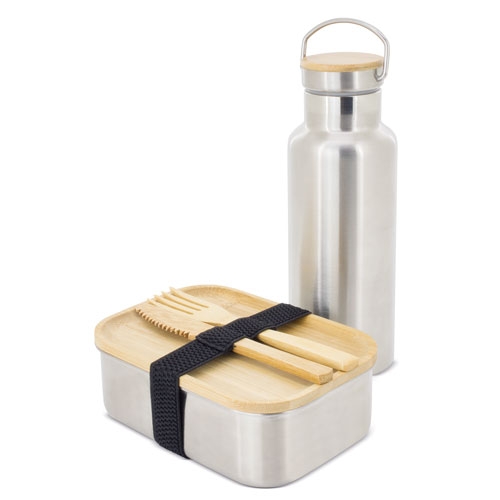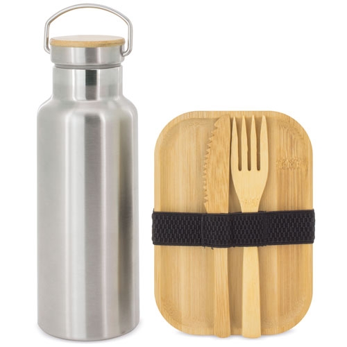 Set de almoço, inclui fiambreira ( medida 16.5*11.5*5.9cm ), faca, garfo e uma garrafa com capacidade de 500 ml. Todo realizado em Bambú e metal inoxidável.