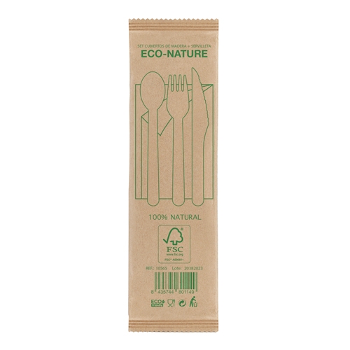 Set de talheres ecológicos, fabricados com madeira procedente de fontes sustentáveis. FSC A000511 Inclui garfo, faca, colher e guardanapo (se vende em múltiplos de 500 unidades)