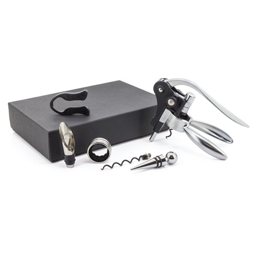 Estojo com abridor de palanca, anel anti-gotas, tapao de vazio, descapsulador e dosificador.