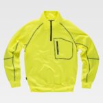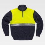 Sweatshirt combinada. Gola alta com meio fecho de correr e costuras reforçadas. Parte superior de alta visibilidade. Suave e cálido acabado no interior. Punhos e cintura elásticos em ponto de canelado.