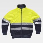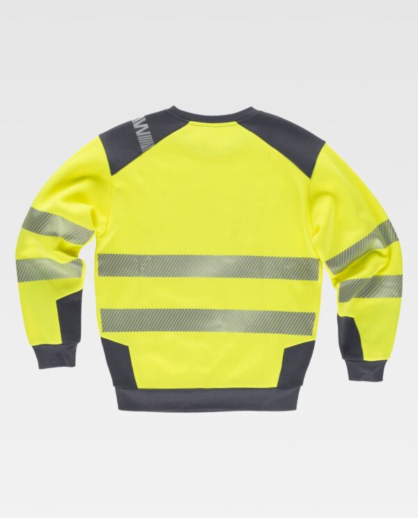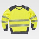 Sweatshirt combinada de alta visibilidade com fitas reflectoras, gola redonda com fitas reflectoras. Abrange nas costuras no interior da gola e costuras reforçadas. Duas fitas reflectoras segmentadas e termo-adesivas no peito, nas costas e nas mangas. Fita decorativa personalizada num dos ombros. Suave e cálido acabado no interior. Gola, punhos e cintura elásticos em ponto de canelado.