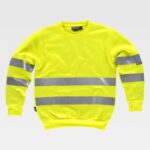Sweatshirt clássica de alta visibilidade, de gola redonda com fitas refletoras. Abrange nas costuras interiores da gola e costuras reforçadas. Duas fitas refletoras no peito, nas costas e nas mangas. Suave e cálido acabado no interior. Punhos e cintura elásticos em ponto de canelado.