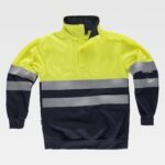 Sweatshirt clássica de alta visibilidade, de gola redonda com fitas refletoras. Abrange nas costuras interiores da gola e costuras reforçadas. Duas fitas refletoras no peito, nas costas e nas mangas. Suave e cálido acabado no interior. Punhos e cintura elásticos em ponto de canelado.