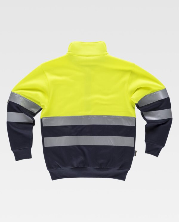 Sweatshirt combinada com fitas refletoras. Gola alta com fecho de correr e costuras reforçadas. Parte superior de alta visibilidade. Dois bolsos laterais interiores. Duas fitas refletoras no peito, nas costas e mangas. Suave e cálido acabado no interior. Punhos e cintura elásticos em ponto de canelado.