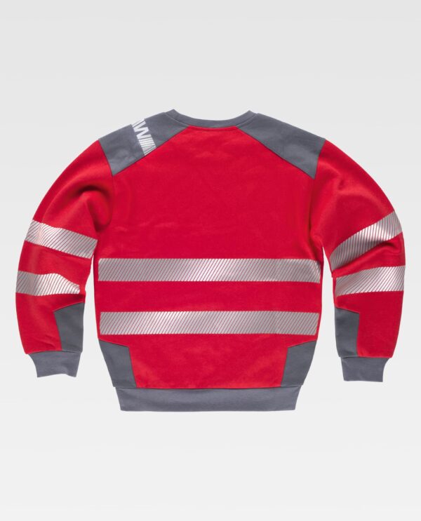 Sweatshirt combinada de alta visibilidade com fitas reflectoras, gola redonda com fitas reflectoras. Abrange nas costuras no interior da gola e costuras reforçadas. Duas fitas reflectoras segmentadas e termo-adesivas no peito, nas costas e nas mangas. Fita decorativa personalizada num dos ombros. Suave e cálido acabado no interior. Gola, punhos e cintura elásticos em ponto de canelado.