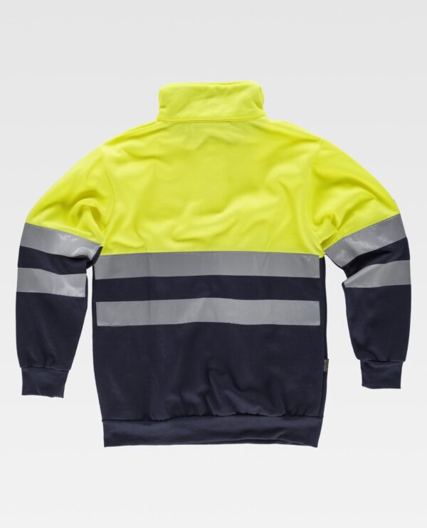 Sweatshirt combinada com fitas refletoras. Parte superior de alta visibilidade. Gola alta com fecho de velcro. Duas fitas refletoras no peito, nas costas e nas mangas. Punhos e cintura elásticos em ponto de canelado.