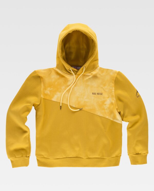 TYER Sweatshirt de homem com capuz e cordao interior para ajustar. Combinada com estampado Tie Dye e corte oblíquo. Punhos e bainha confecionados em tecido elástico. Detalhes de logótipo bordados no peito e manga. Fabricada em calidades French Terry na parte estampada; o interior forrado na cor lisa assegura um grande conforto.