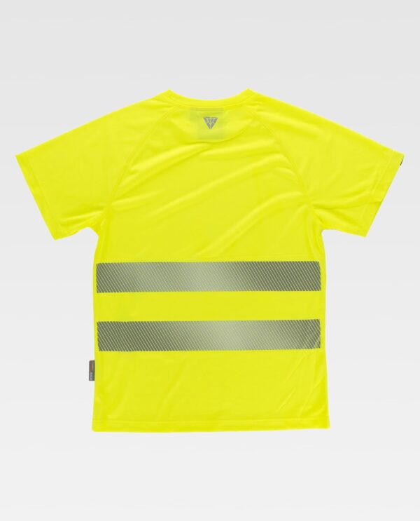 T-shirt de alta visibilidade. Mangas curtas em poliéster micro-piqué com fitas reflectoras segmentadas. Gola redonda com bainha interior. Mangas raglan. Duas fitas reflectoras segmentadas termo-adesivas no peito e nas costas. Tecido técnico transpirável com tratamento com iões de prata para inibir o crecimento das bacterias e assim evitar a absorção da humidade e o mau cheiro.