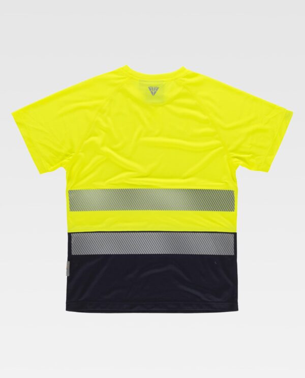 T-shirt combinada com alta visibilidade. Mangas curtas em poliéster micro-piqué com fitas reflectoras segmentadas. Gola redonda com bainha interior. Mangas raglan. Duas fitas reflectoras segmentadas termo-adesivas no peito e nas costas. Tecido técnico transpirável com tratamento com iões de prata para inibir o crecimento das bacterias e assim evitar a absorção da humidade e o mau cheiro.
