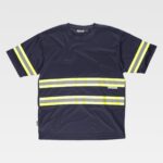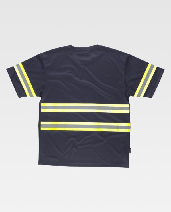 T-shirt clássica de manga curta em tecido piqué com fitas refletoras-fluorescentes. Gola redonda com abrange nas costuras no interior. Uma fita fluorescente com uma fita refletora nas mangas e duas no peito e nas costas.