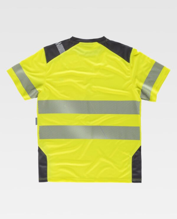 T-shirt de alta visibilidade combinada. Manga curta em micropique de poliéster e fitas refletoras segmentadas. Gola redonda e faixa em contraste nos ombros e laterais. Um bolso no peito. Uma fita refletora segmentada termo-adesiva nas mangas e duas de diferente tamanho no peito e nas costas. Fita decorativa personalizada no ombro. Tecido fino e ligeiro de alta permeabilidade ao ar. Transpirável, de secagem rápida e resistente ao encolhimento.