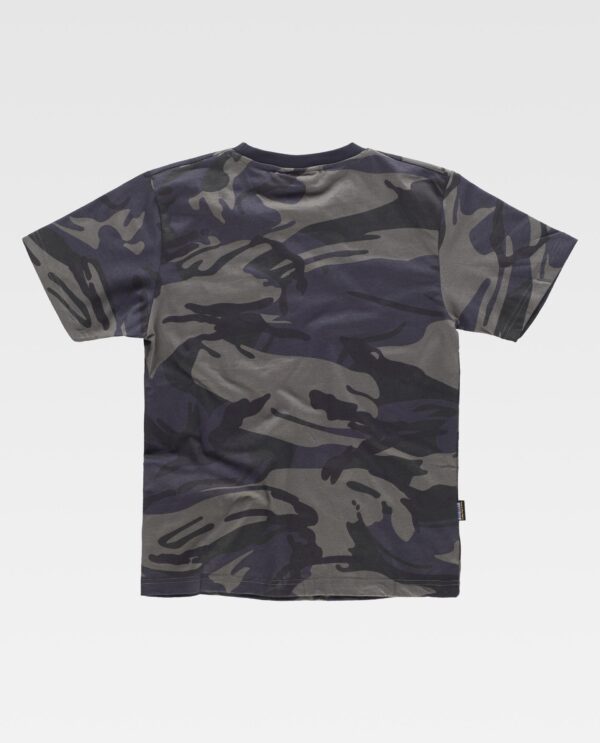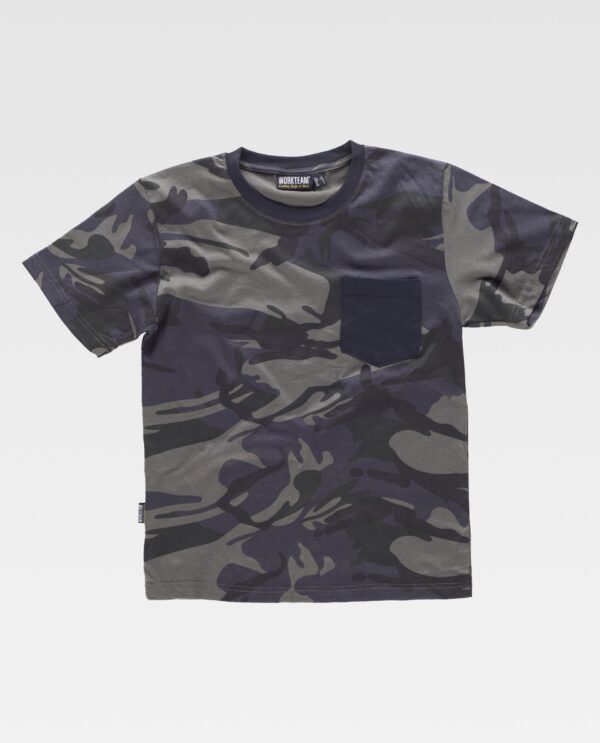 T-shirt de manga curta de algodão com impresso de camuflagem. Gola redonda em ponto de canelado com abrange nas costuras interior. Um bolso de chapa no peito em contraste. Costuras reforçadas.