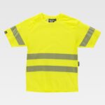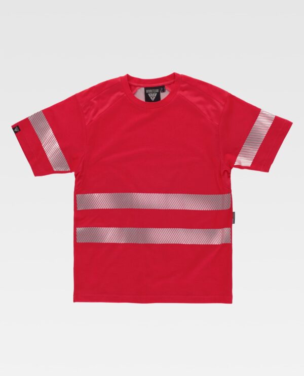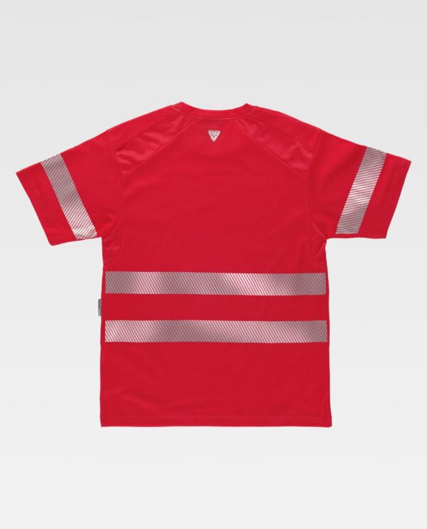 T-shirt de manga curta em micro-piqué de poliéster com interior de algodão. Refletoras segmentadas e tecido de malha para regular a transpirabilidade. Gola clássica com abrange no interior. Uma fita segmentada termo-adesiva nas mangas e duas no peito e costas.