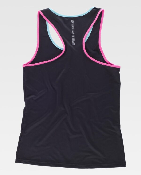 T-shirt sem mangas. Gola redonda com debrum em contraste. Vivos refletores. Elástica e confortável, seu desenho é adaptável ao corpo. Óptimo para praticar desporto.