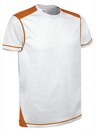 T-shirt desporto de manga curta, gola redonda e desenho bicolor. Confecionada em tecido técnico respirável Bird-Eye que facilita a secagem rápida e a eliminação do suor. Desenho bicolor e facilmente combinável: costuras, ombros e detalhes laterais em cores vivas combinadas em contraste com branco. Costuras planas nos ombros e zona das axilas que minimizam a fricção contra a pele. Métodos adequados de marcação: sublimação sobre a cor branca, serigrafia, transfer, vinil, bordados, cosidos. Ideal para actividades físicas e como roupa desportiva.