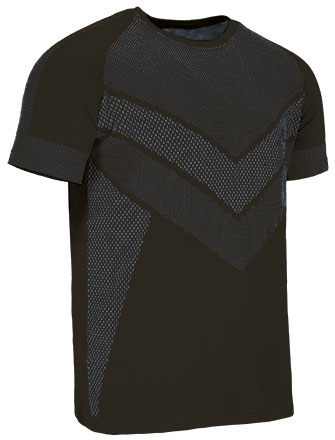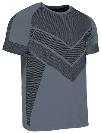 T-shirt desporto de manga curta bicolor. Confecionada com tecido respirável Intarsia 2D de gran elasticidade, tecido Jacquard micro-perfurado na zona das axilas, dorso das costas para maior ventilação, reforçada com canales de compressão nos ombros e laterais para maior liberdade de movimento. Cosida mediante os métodos seamless (sem costura) e flat seam (costuras planas) que suavizam o toque com a pele. Desenho anatômico e dinâmico que aporta maior mobilidade. Gola redonda com fita interior que mantém sua forma, dupla capa de canalé elástico que se adapta confortavelmente, manga raglan com costura plana e dobrado de canalé extra elástico com costura invisível para maior conforto. Ideal como roupa desportiva de alta performance.