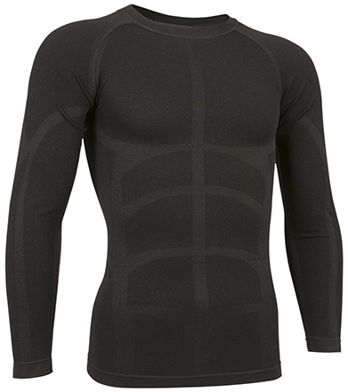 T-shirt térmica elástica de manga comprida, gola redonda e com efeito segunda pele. Confecionada em tecido respirável de 2D Intarsia com alta elasticidade. Fabricada usando métodos deseamless (sem costuras) y flat seam (costuras planas) que minimizam a fricção contra a pele. Desenho anatómico e dinâmico que favorece a mobilidade. Ideal como roupa interior para atividades que requerem esforço físico.