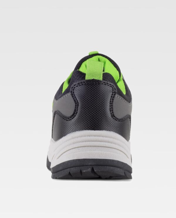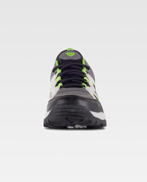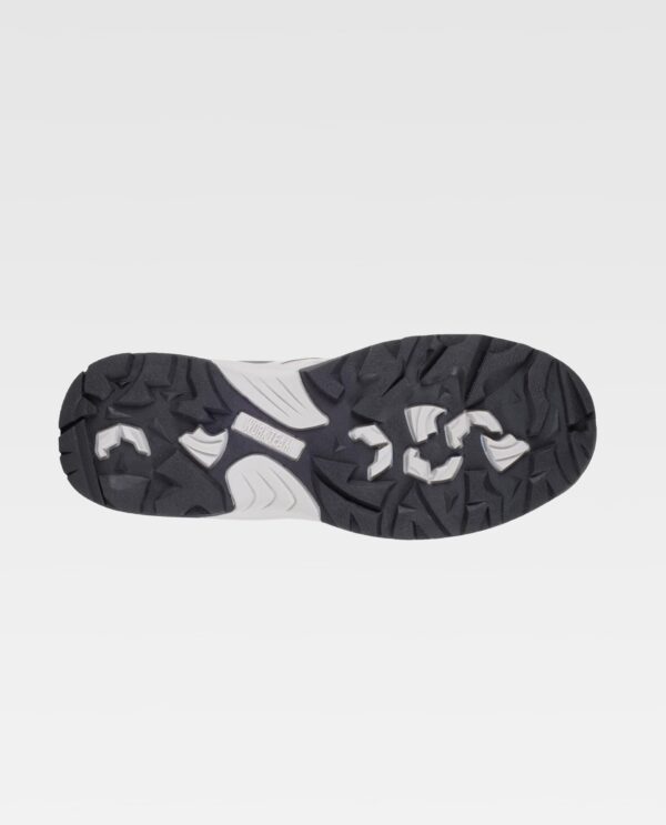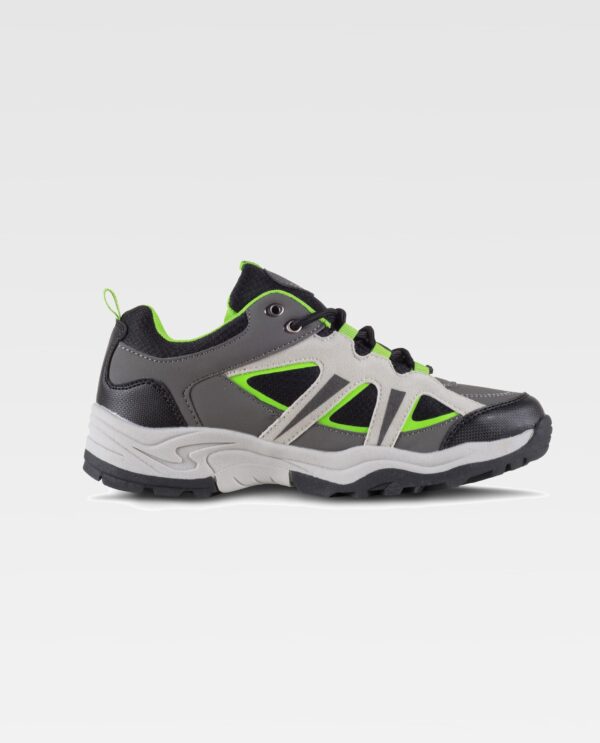 Sapato tipo trecking com cordões. Ilhós metálicos e presilhas em tecido. Sola combinada em duas cores, de ligeira goma TPR, grande resistência ao deslizamento. Presilha para tirar na parte trás do calcanhar e na lingueta. Partes laterais combinadas com camadas sobrepostas. Calcanhar e lingueta, forrados em tecido de malha a contraste. Recomendável para o uso no exterior.