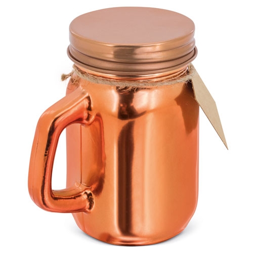 Vela metálica com cheiro a canela, inclui um cartao para personalizar.Venda em múltiplos de 25 unidades