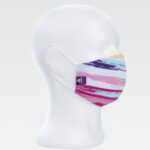 Máscara reutilizável em tecido elástico e estampada. Pode inserir o filtro no interior. Inclui dois filtros.