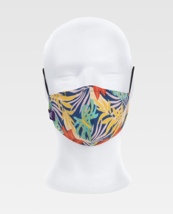 Máscara reutilizável em tecido elástico e estampada. Pode inserir o filtro no interior. Inclui dois filtros.