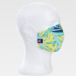 Máscara reutilizável em tecido elástico e estampada. Pode inserir o filtro no interior. Inclui dois filtros.