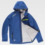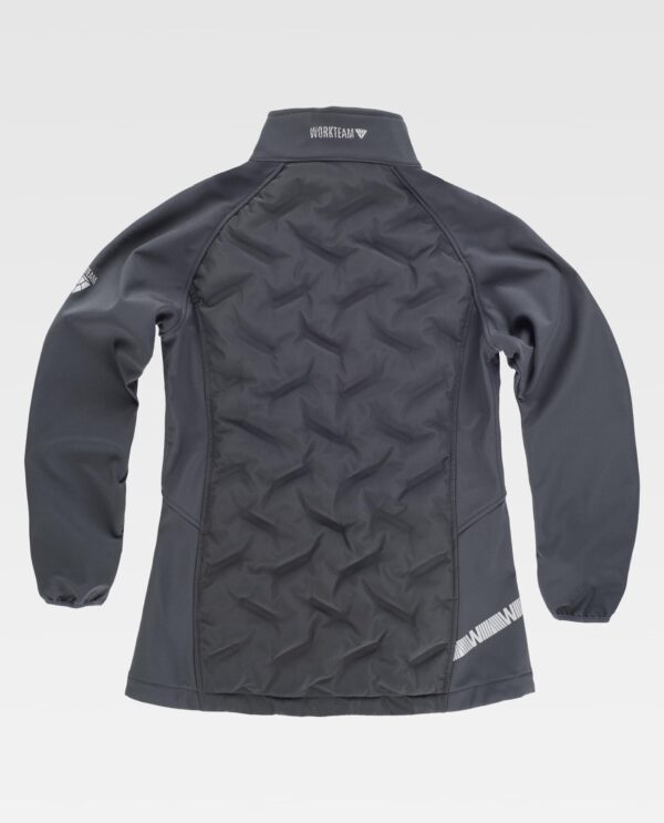 Workshell de mulher combinado com tecido acolchoado selado e detalhes reflectores. Gola alta com fecho de correr em nylon. Aba protetora interior com volta na parte superior protegendo o fecho de correr. Um bolso no peito e dois bolsos laterais interiores com fecho de correr em nylon. Fita reflectora decorativa personalizada de um lado. Punhos com debrum elástico.